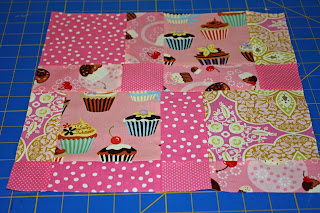 I tried the Disappearing 9 Patch technique with some pink scraps I had laying around: